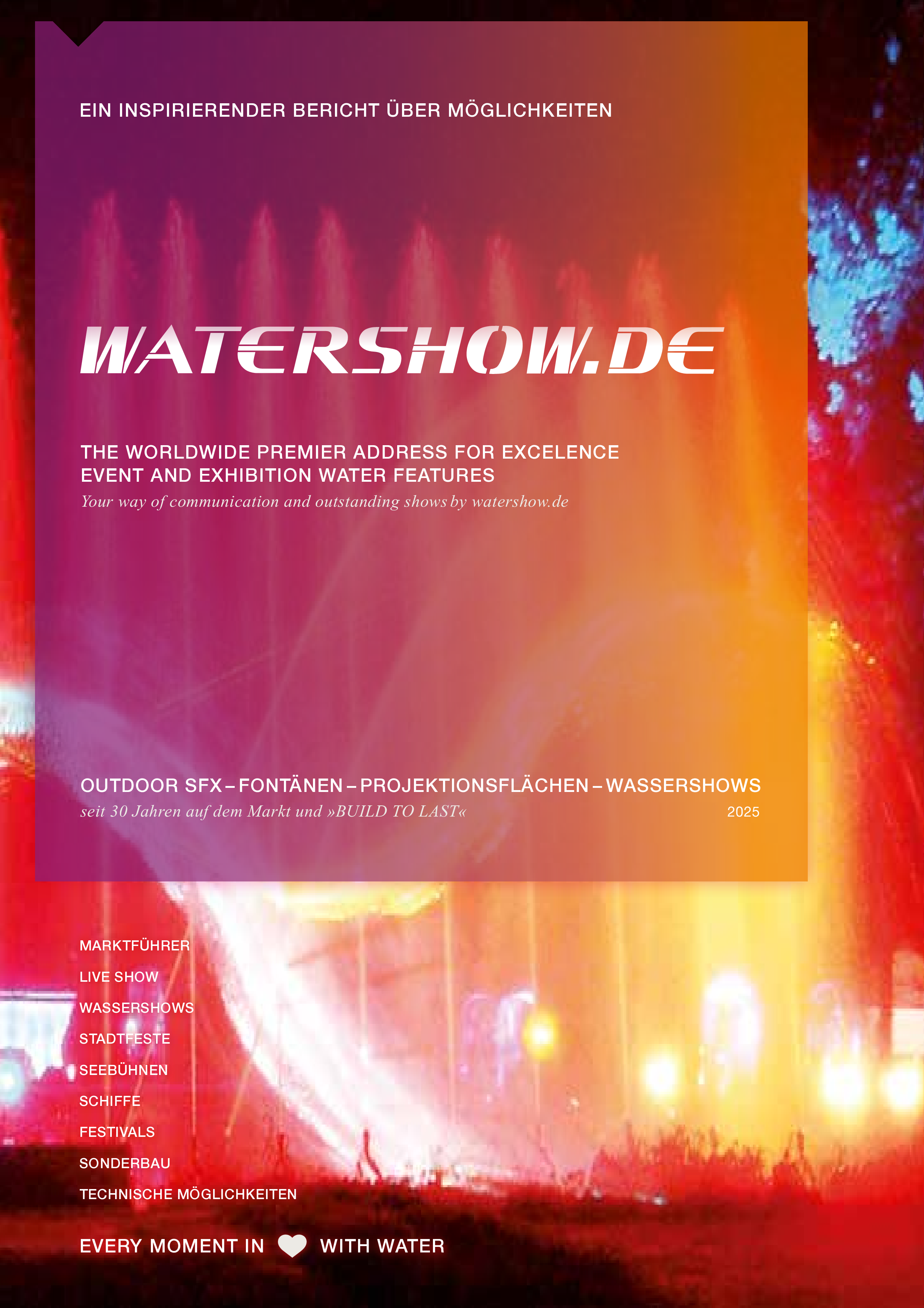 Watershow.de GmbH verwandelt Wasser in unvergessliche Erlebnisse. Von funkelnden Fontänen und eleganten Wasserwänden bis hin zu hochmodernen Wasserscreens, die Logos und Bilder mit fallenden Tropfen schreiben. Jede Show ist ein einzigartiges Highlight. Mit individuellen Lösungen, perfekter Technik und beeindruckender visueller Wirkung lässt Watershow.de Marken erstrahlen und Events unvergesslich werden.